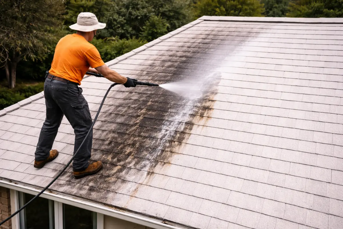 You see the streaks. You rent a pressure washer. You point it at the roof and blast the algae off. Problem solved, right?