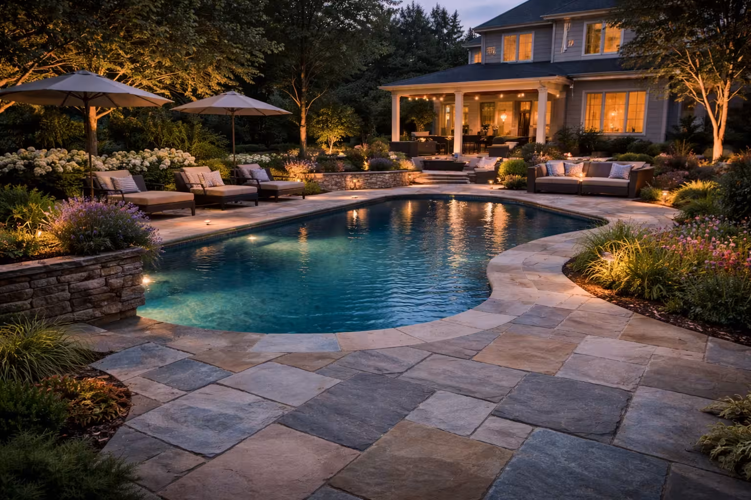 Bluestone, flagstone, and limestone in pool-rated thickness.