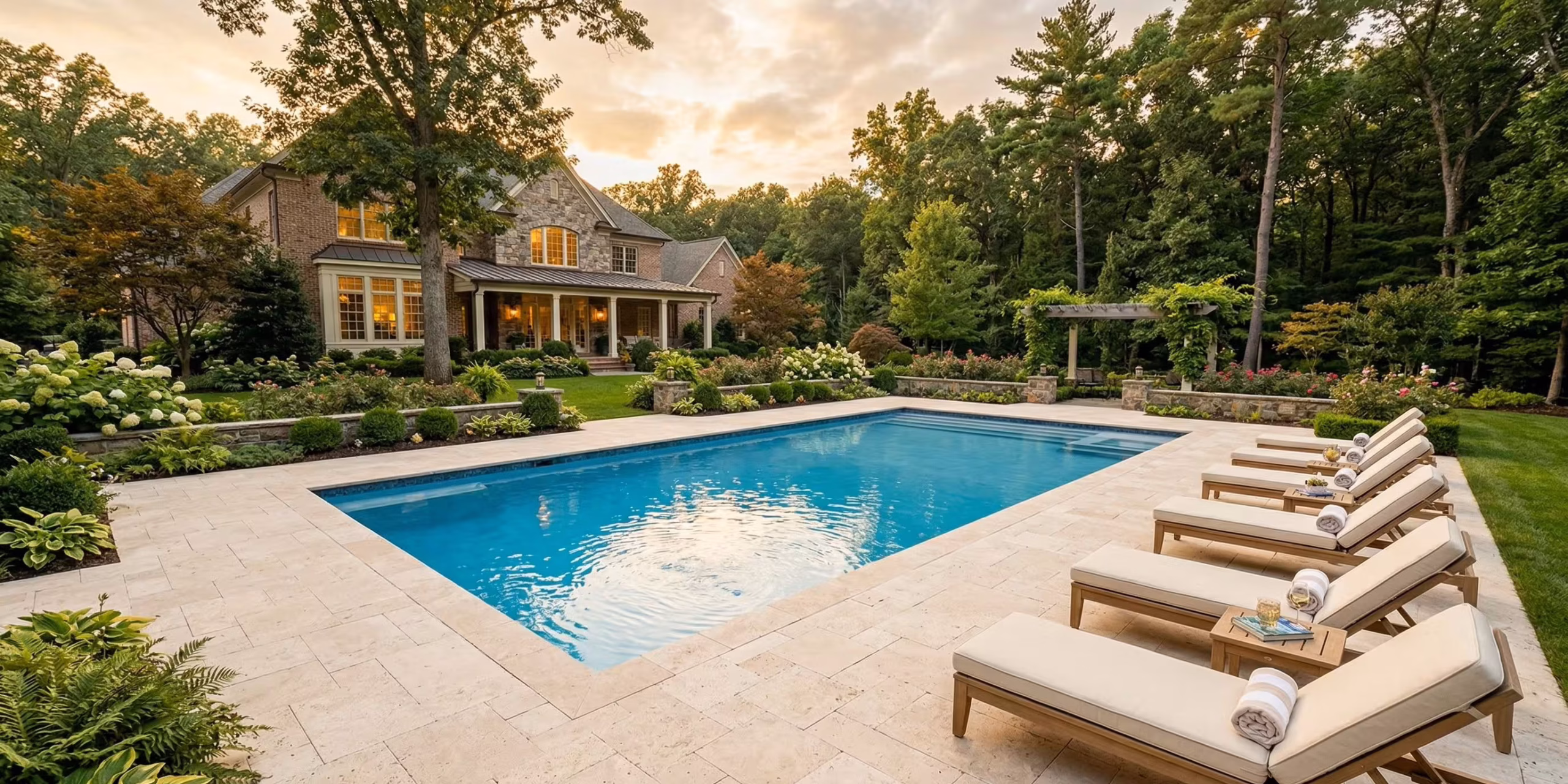 Premium tumbled or honed travertine — the gold standard for pool patios.
