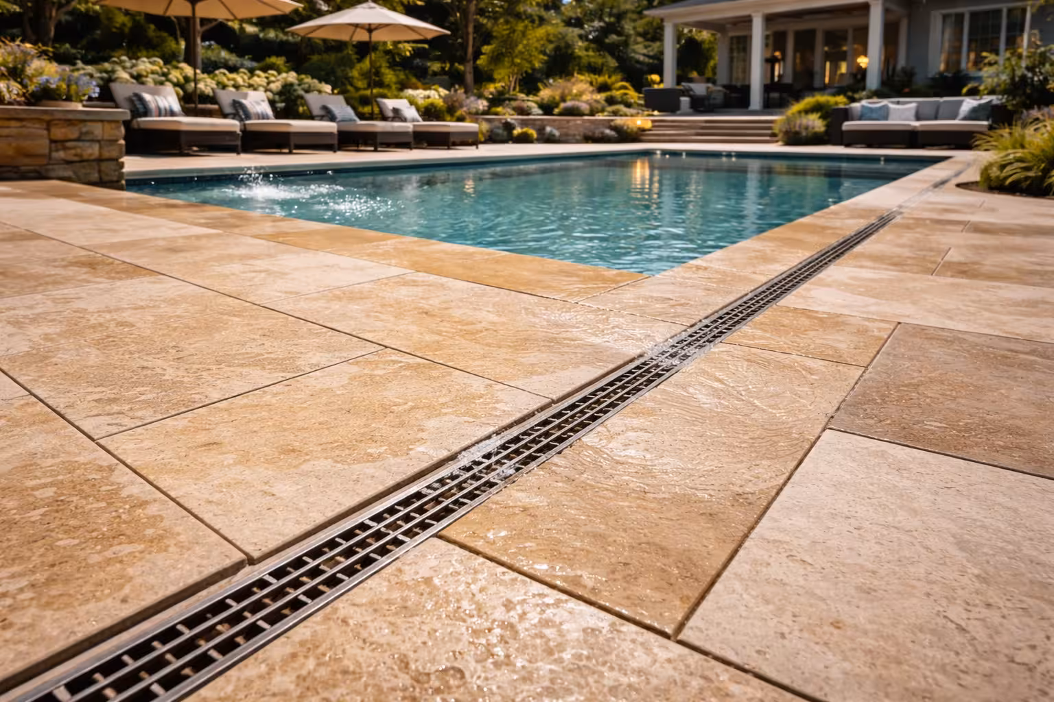 Travertine, porcelain, and tumbled pavers stay cool and grip wet feet