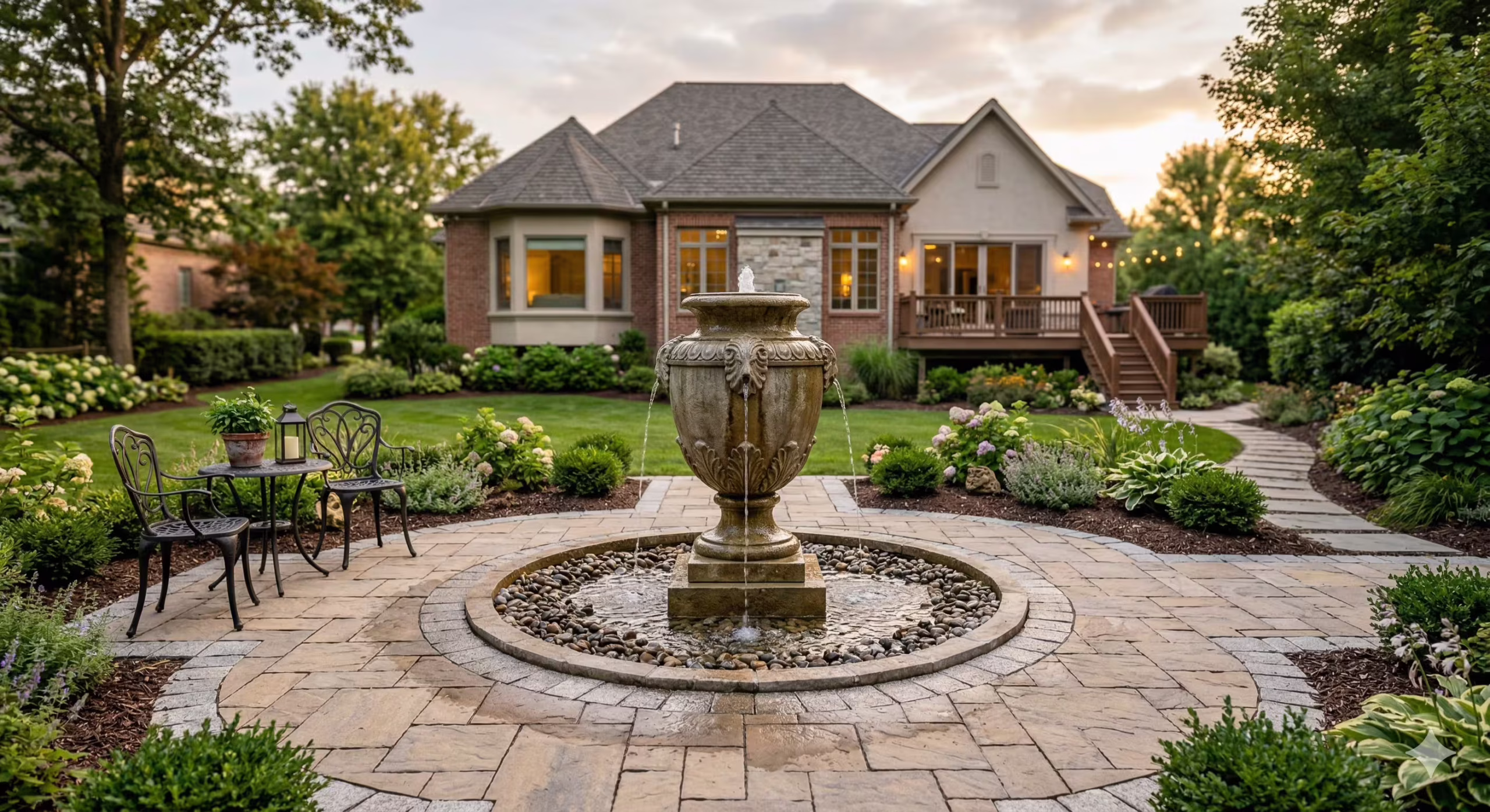 Decorative urn fountain on a paver base for a patio centerpiece.