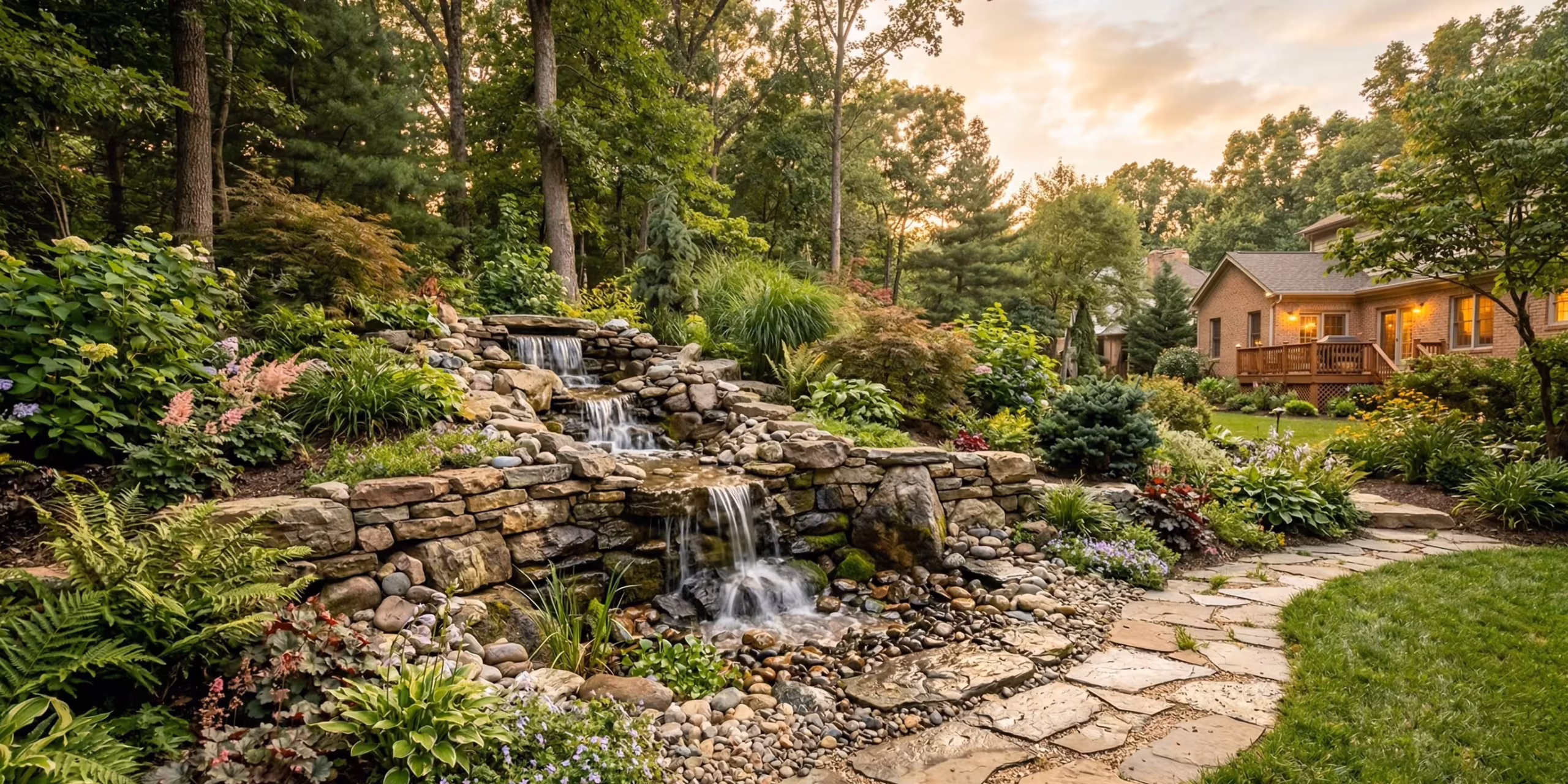 Stacked stone pondless waterfall winding through plantings.