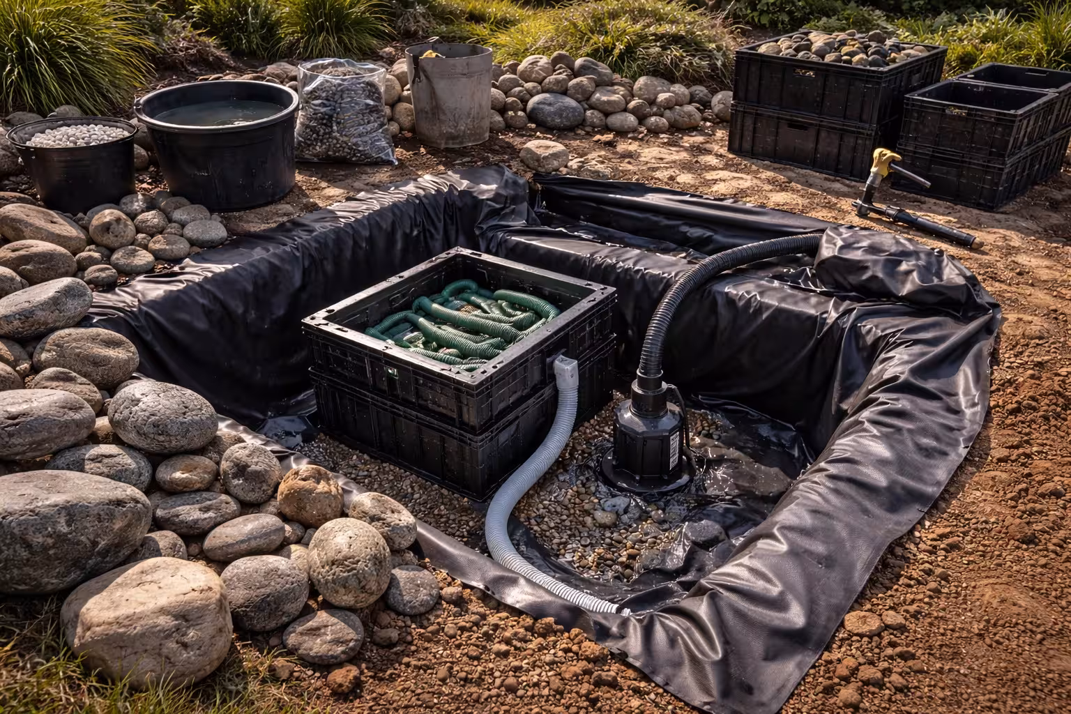 Install pump, basin, stone, and plumbing.